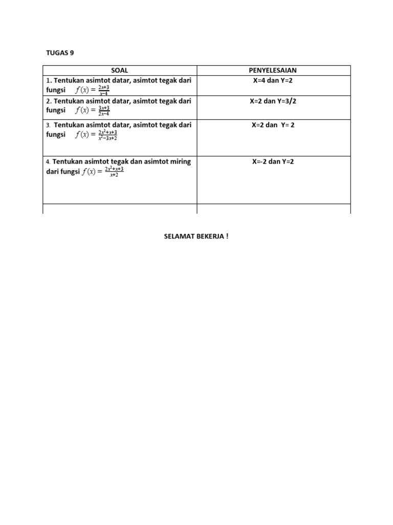 Fungsi Rasional from image.slidesharecdn.com Kemudian, grafik fungsi digeser sejauh 2 satuan ke kanan, akibatnya asimtot tegaknya juga ikut bergeser sejauh 2 satuan ke kanan dari sebelumnya x = 2 menjadi x = 4. Seperti pada gambar berikut : Asimtot datar tidak ada ketika pangkat terbesar. Tentukan asimtot datar dan asimtot tegak persamaan grafik fungsi rasional berikut ! Karenanya, dan harus dikecualikan dari daerah asal. Seperti pada gambar berikut : Karena l ( 8 ) = 32 merupakan luas maksimum, maka ukuran persegi panjang agar luasnya maksimum adalah 2.op × 2.pq = 2 8 × 2 8 = 4 2 × 4 2 (ans). Soal soal untuk menentukan asimtot tegak dan mendatar fungsi aljabar ternyata dikeluarkan pada sbmptn 2017 seleksi bersama masuk perguruan tinggi negeri untuk matematika ipa atau saintek.